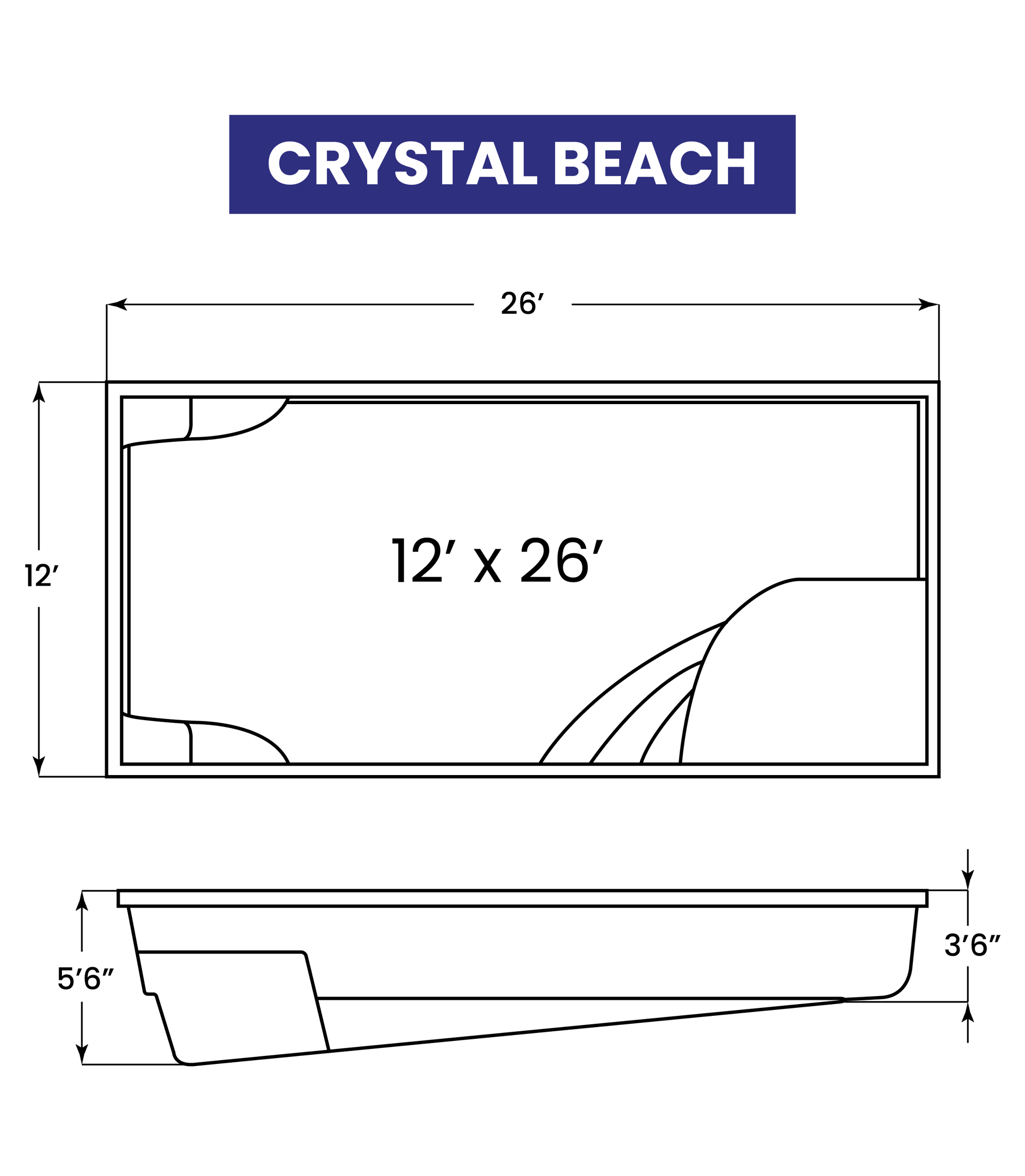 The Crystal Beach model captures the essence of its namesake's clear waters in a compact design. Measuring 12 feet wide by 26 feet long, this pool is an excellent choice for smaller yards or those seeking a more intimate aquatic retreat. Despite its modest size, the Crystal Beach doesn't compromise on features. It offers a depth range from 3 feet to 5 feet, suitable for various water activities. The pool includes a cozy seating area at the shallow end, ideal for soaking and unwinding after a long day.