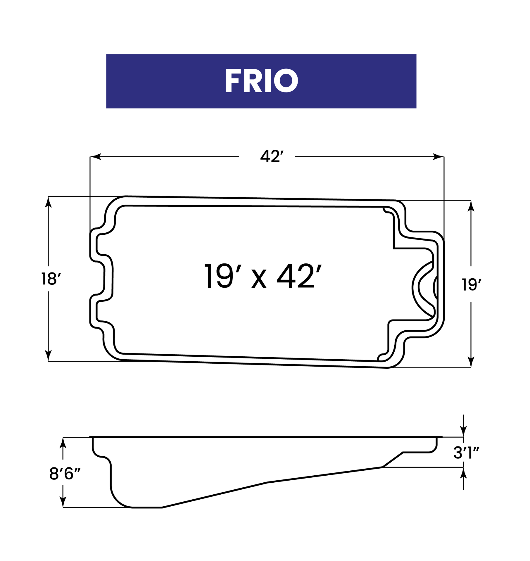 A New Model Available Exclusively from American Fiberglass Pools. The Frio is one of the largest fiberglass pools available in the world. A diving capable pool that is 18 ft. wide and 42 ft. long. As they say in Texas, the Frio is the "Muy Grande" of the fiberglass pool industry. Almost 750 sq. ft. of cool, clear, refreshing water. The Frio not only allows diving, but has a huge shallow area of almost 325 sq. ft. The steps and seats are designed not to interfere with the shallow end activities. Do you think big? Then consider the Frio, they do not make them any bigger.