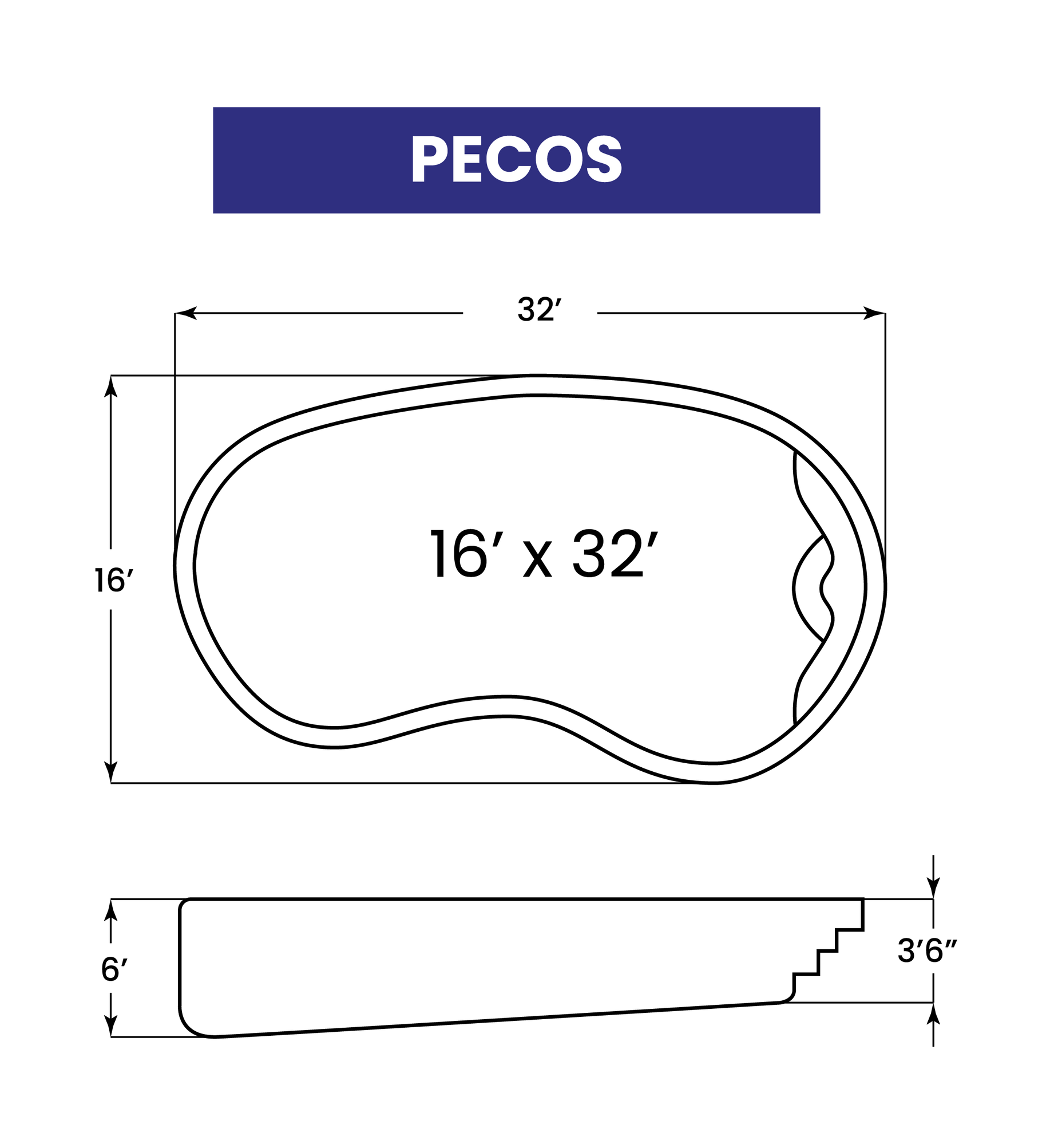 The Pecos features gentle curves that bring to mind the beauty and picturesque quality of the fountains of Rome. The curved entrance also affords practicality- with a lounging seat that allows you to simply relax in the refreshing coolness of the Pecos. The Pecos ranges in depth from 3 ½ feet to 5 ½ or 6 foot maximum depth models, making it perfect for swimming activities and families with small children. Redwood, concrete, or tile would beautifully complement this elegant yet practical American Fiberglass Pool. For a similar pool with more depth, see The Brazos