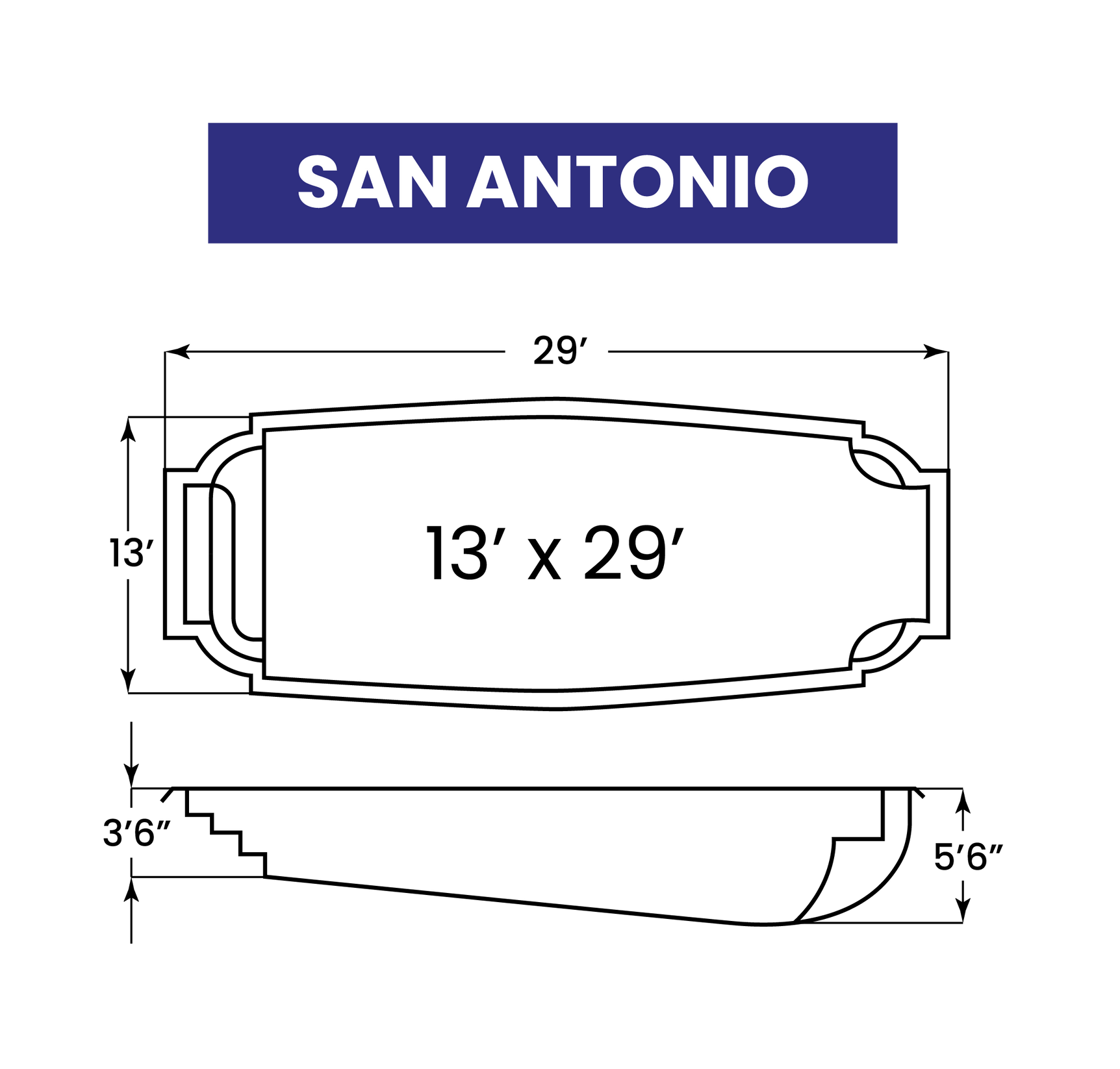 The San Antonio has the gentle curves, the meandering elegance of the river for which it is named. One of the all time top selections of American Fiberglass Pools customers, truly a prevailing choice in design for the aristocratic pool buyer. The stairs on the San Antonio cover the entire width of the shallow end, the second stair can also be used as a bench for the lounging to be expected by the relaxing pool owner. As well, there are two seats on the deep end walls to accommodate the rest of the family.