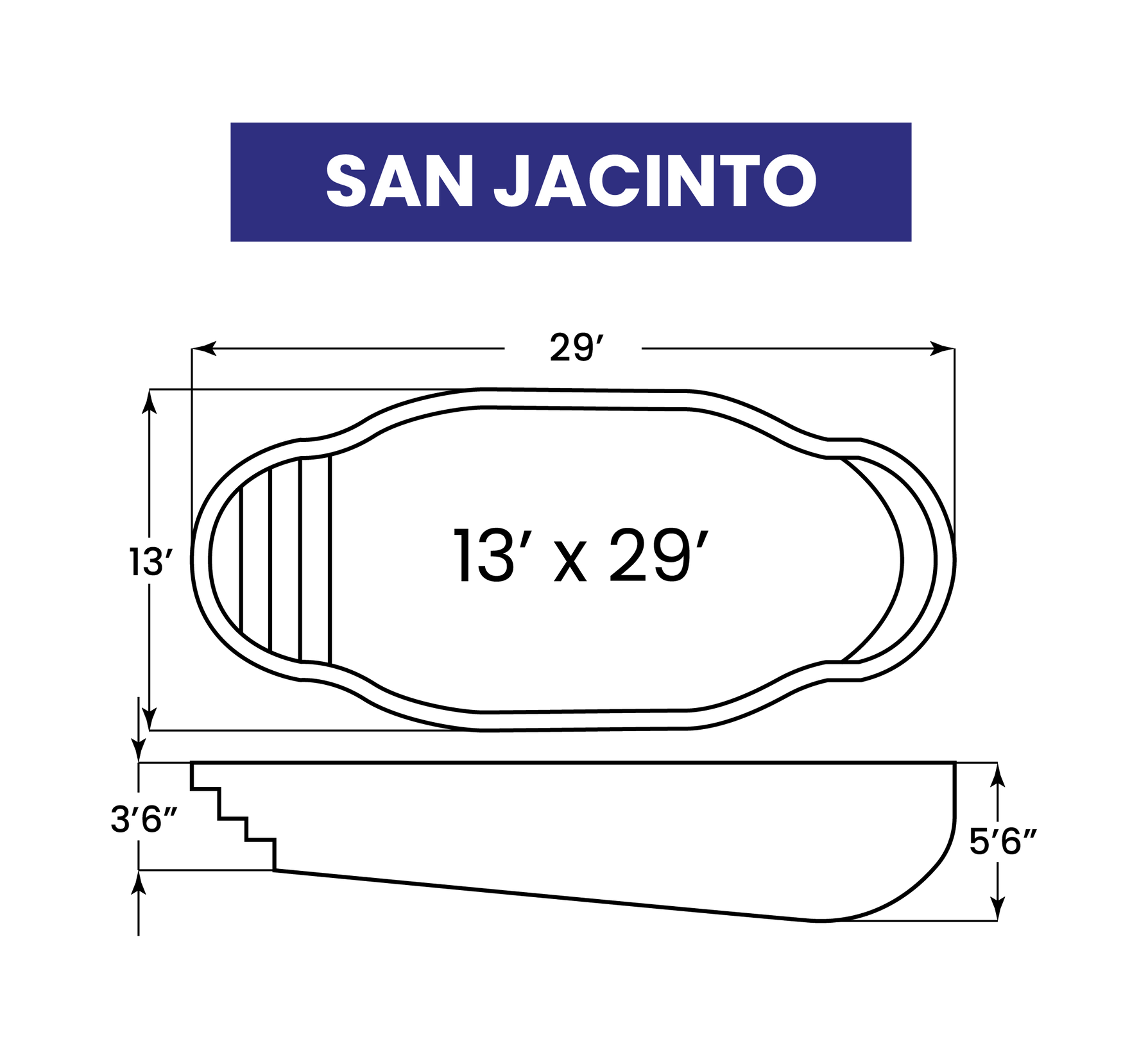 The San Jacinto by American Fiberglass Pools brings an extra dimension of fun and beauty to a backyard. With its 13-foot width and 29-foot length, the San Jacinto packs a lot of swimming area into a limited space. This fun pool ranges in depth from 3½ to 5½ feet. The elegantly shaped entrance of the San Jacinto adds classic lines and styles to any backyard, giving it unmatched beauty. The lounging seat that stretches across the entrance allows the young and old alike to simply relax in the coolness of the San Jacinto. This beautiful American Fiberglass Pool can be perfectly accented with any decking you can imagine. Tile, redwood, or concrete can be shaped to add an extra dimension to this stunning pool.