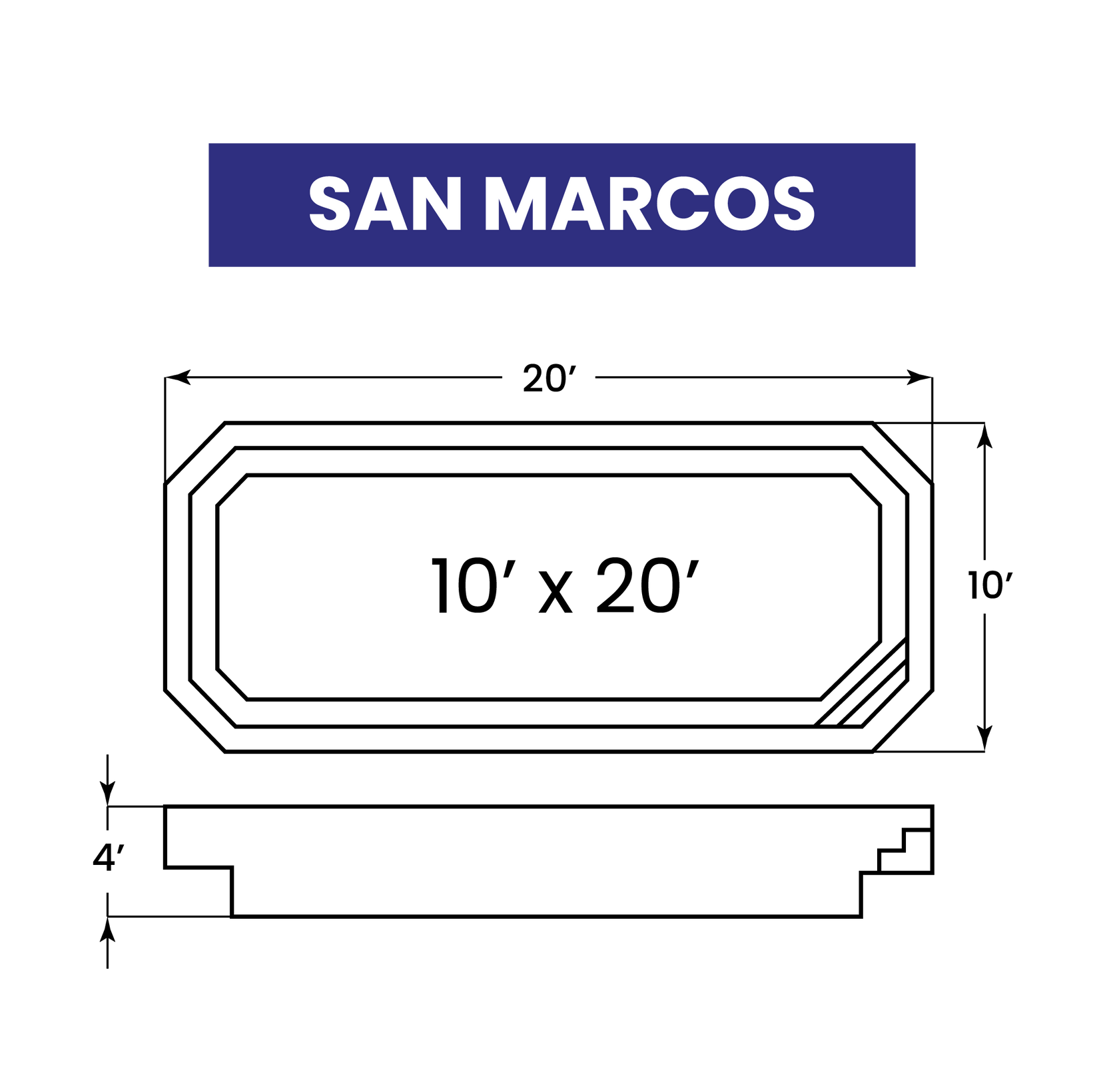 The San Marcos is an excellent size for confined backyards or as a pool sized for those who just wish to get wet! The 4′ depth is just right for water aerobics. The bench seat surrounds the entire pool perimeter and can have hydro therapy jets installed to make the San Marcos one of the biggest spas in the world! The San Marcos can also be an above the ground installation! Ask American Fiberglass Pools about the details for a "permanent" above ground pool.