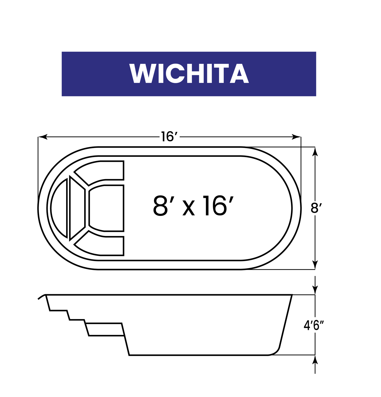 The Wichita is a superb choice for water aerobics. The constant depth gives you an option of swimming pool or the addition of swim-jets for a "swim machine" effect. The Wichita will fit almost anywhere so check with American Fiberglass Pools before you let easements and building lines ruin your dream of pool ownership.